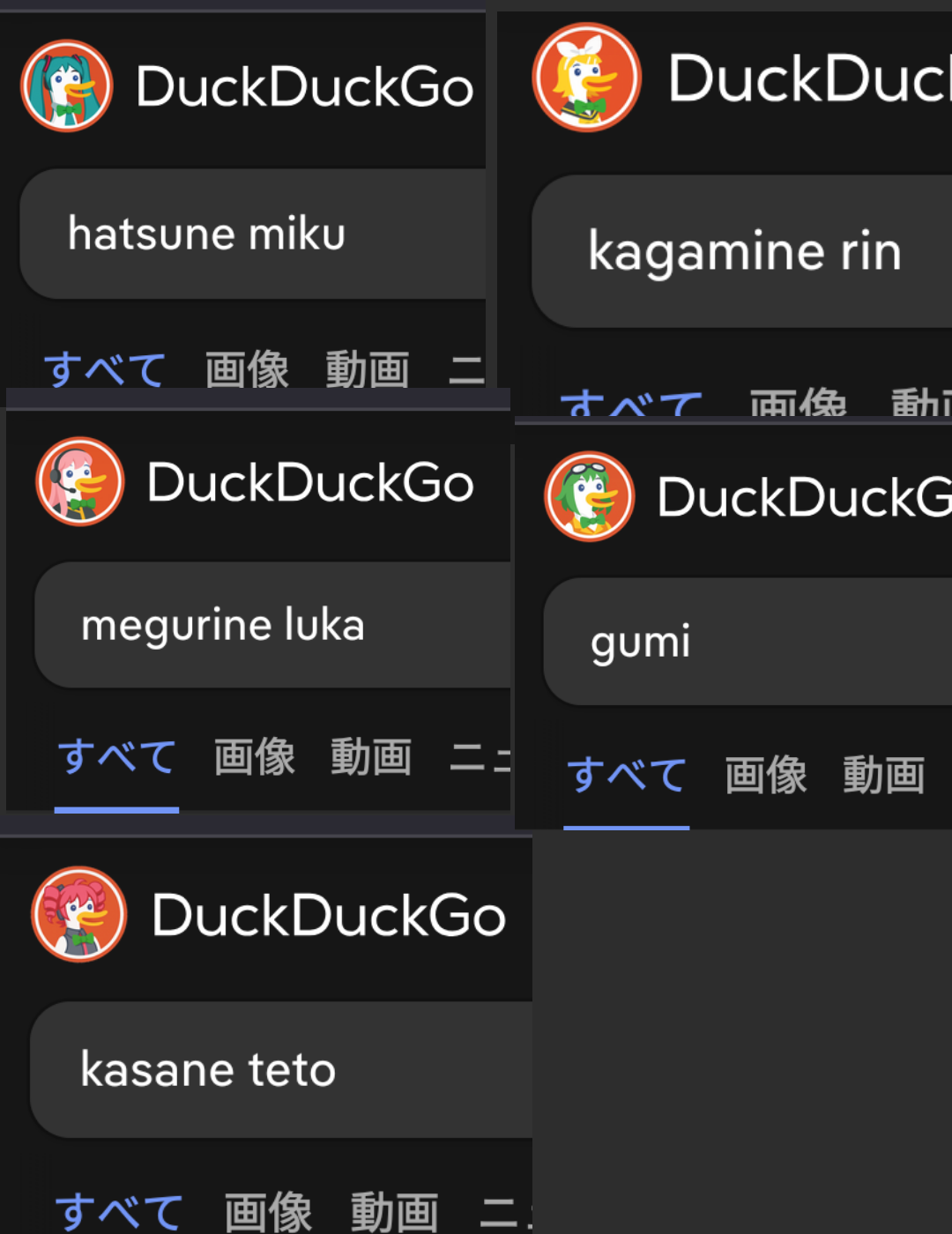 DuckDuckGo (https://duckduckgo.com/) で一部のボカロ(広義)キャラの名前を入れて検索すると、DuckDuckGoのロゴのアヒルがコスプレします