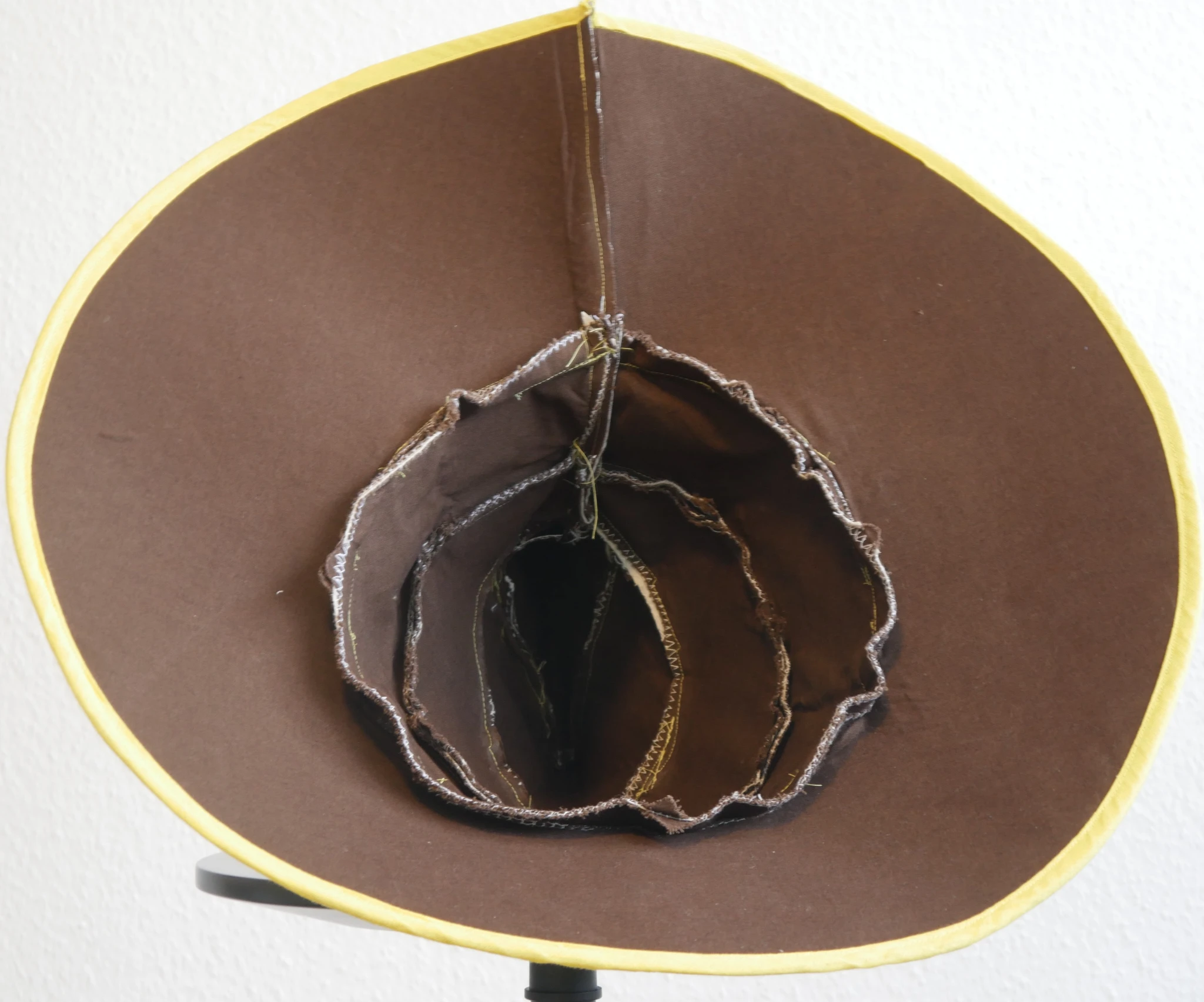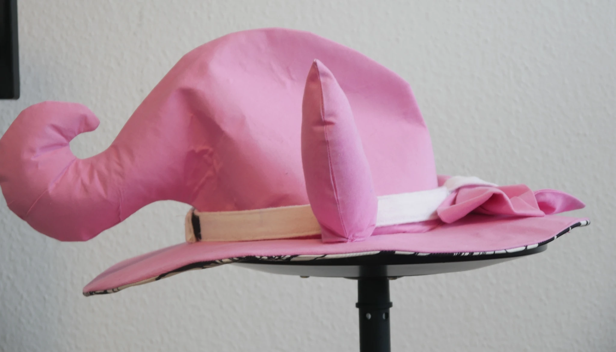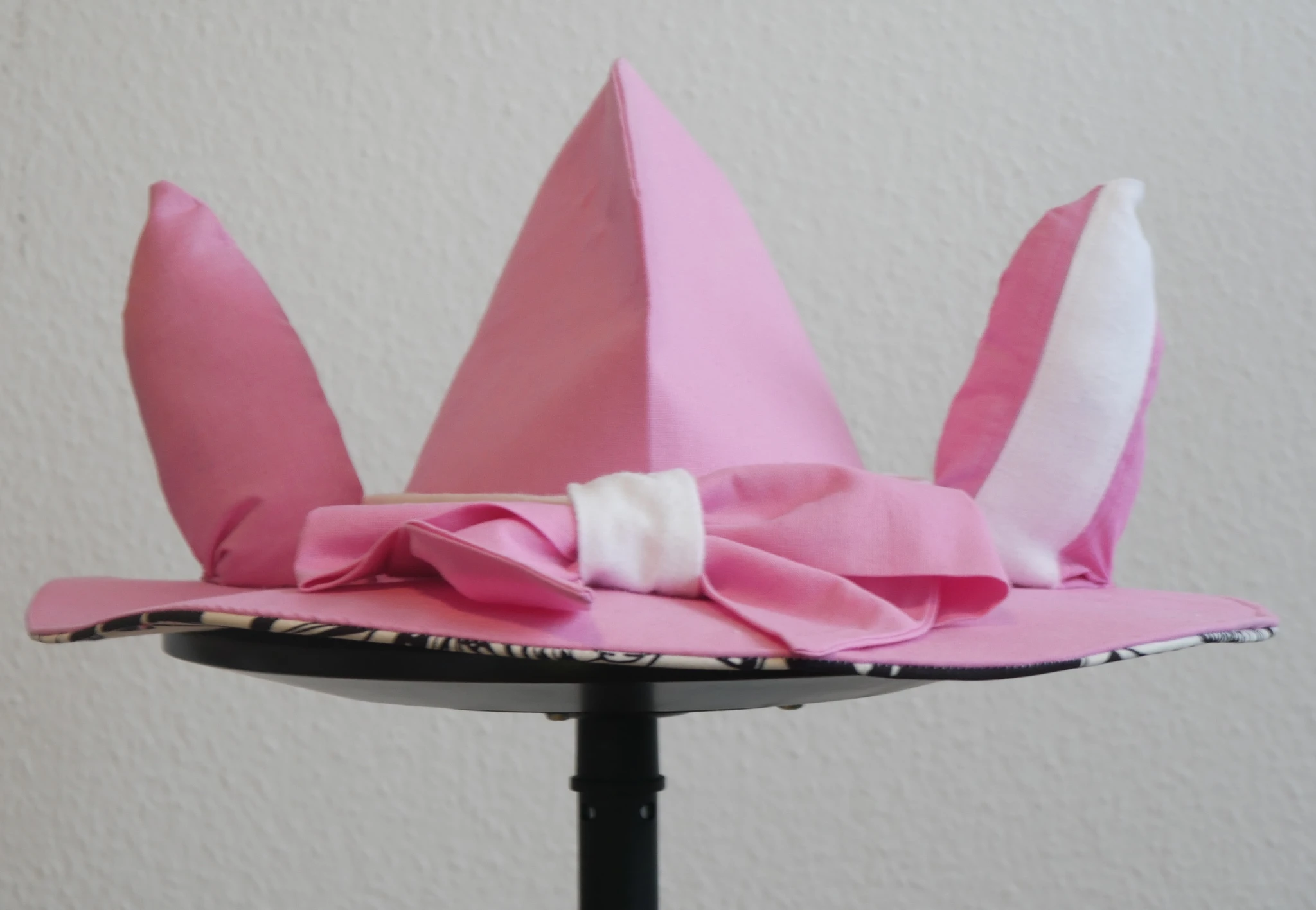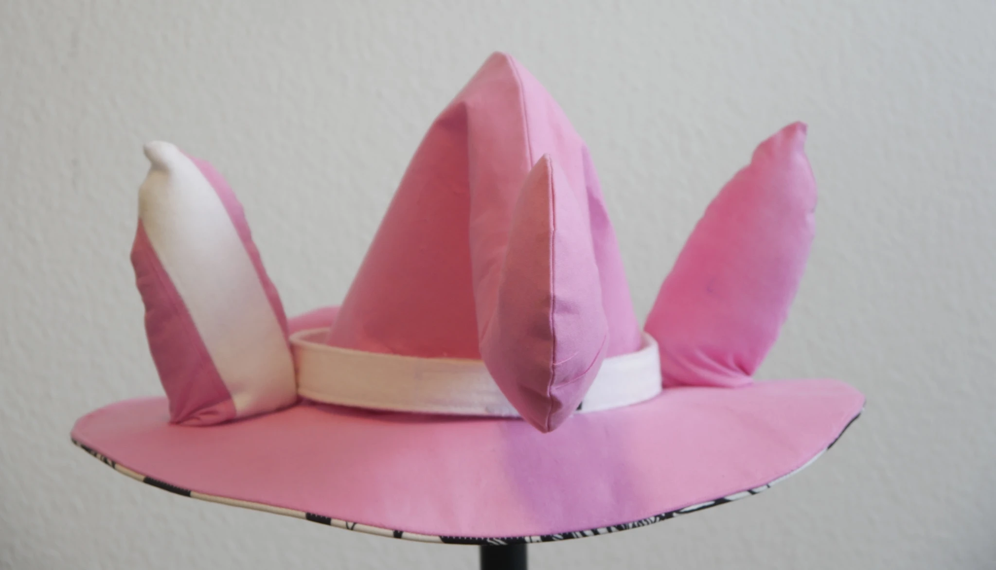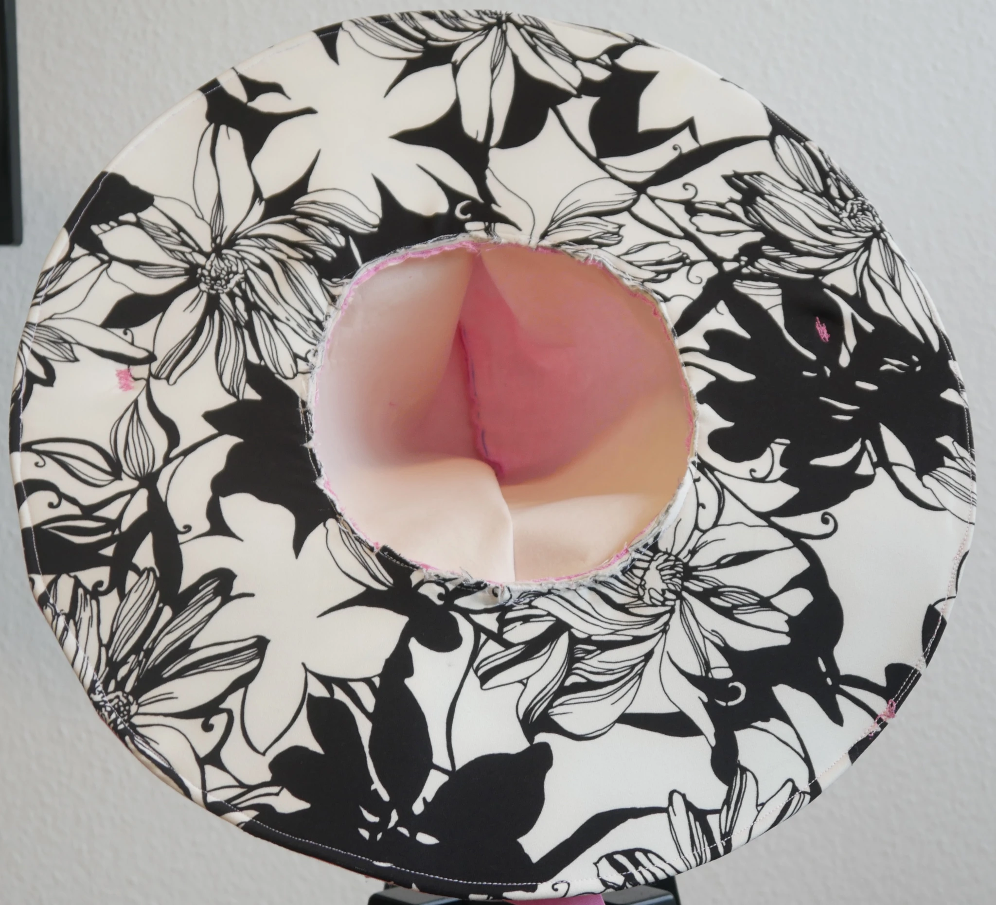 For the underside of the brim I decided to have some fun and used some black and white flowery fabric I had lying around. Attaching the brim to the crown was a bit difficult for all those layers of fabric and Decovil. But was doable. Pretty sure I broke a needle though lol. (I broke so many with the megu hat